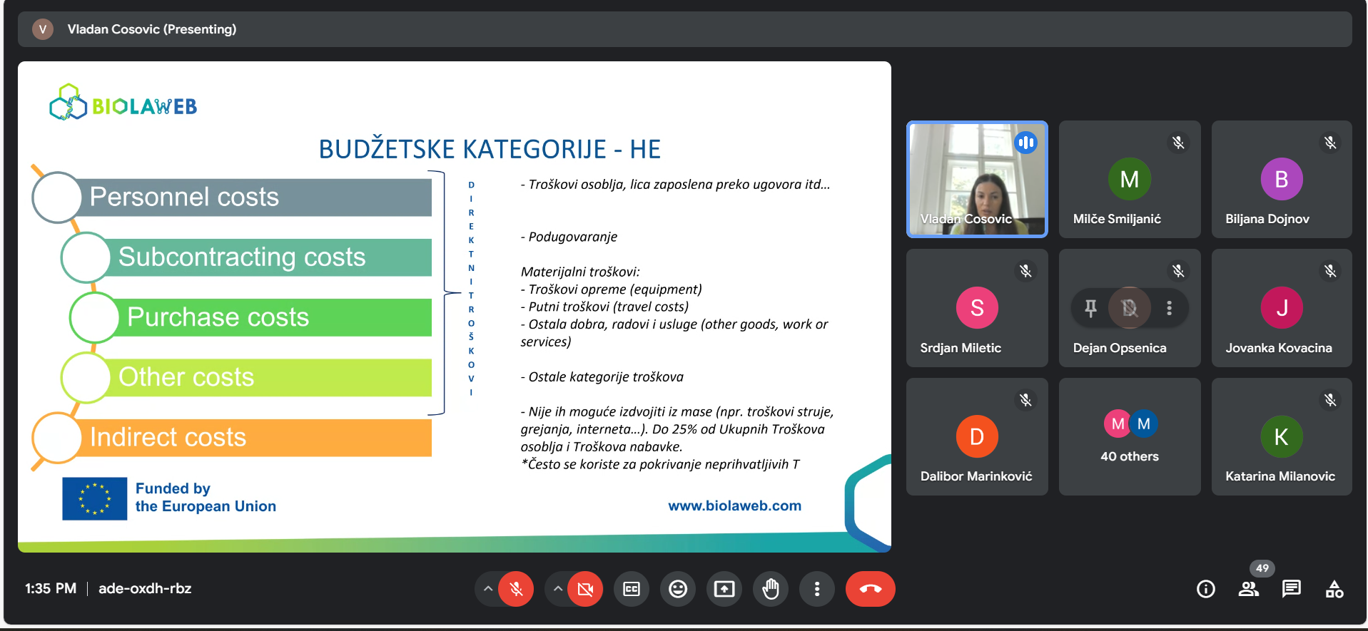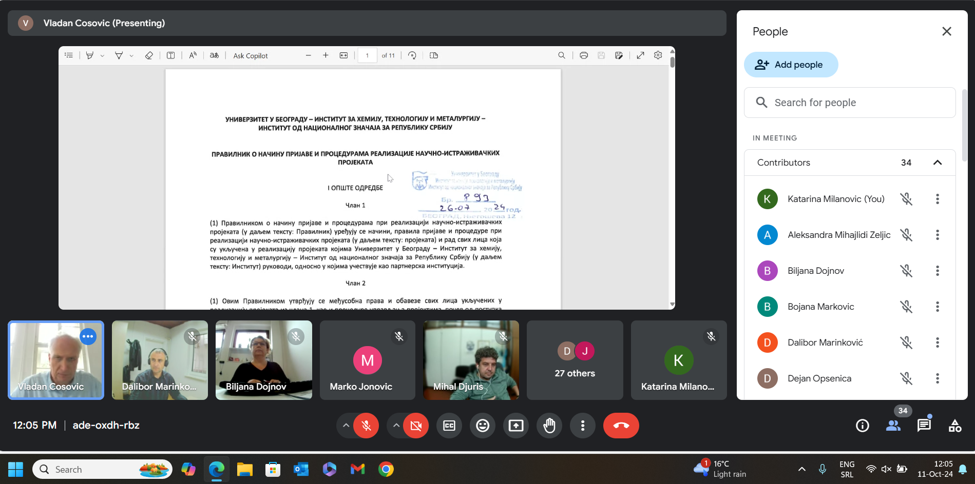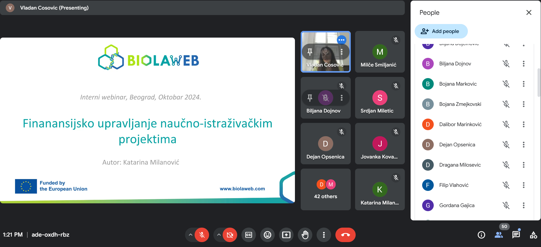 Канцеларија за пројекте и међународну сарадњу ИХТМ-а је 11. октобра одржала интерни вебинар ком су присуствовала 52 учесника. Вебинар је отворио руководилац Канцеларије, који је запослене упознао са Правилником о поступку подношења пријава и процедурама за реализацију научно-истраживачких пројеката. Након тога, Драгана Златовић, руководилац Одељења за набавке, представила је процедуре набавке робе и услуга. На крају, Катарина Милановић је изложила основна правила финансијског управљања за научно-истраживачке пројекте.