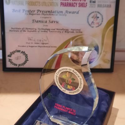 Danica Savić, istraživač pripravnik Centra za hemiju IHTM nagrađena je za najbolju poster prezentaciju na 5. Konferenciji o medicinskim i aromatičnim biljkama država jugoistočne Evrope (5th International Conference on Natural Products Utilization: from Plants to Pharmacy Shelf, ICNPU-2023) koja je održana u Varni, Bugarska, od 30 maja do 2. juna 2023. Čestitamo koleginici Danici Savić i želimo joj puno uspeha u daljem radu!