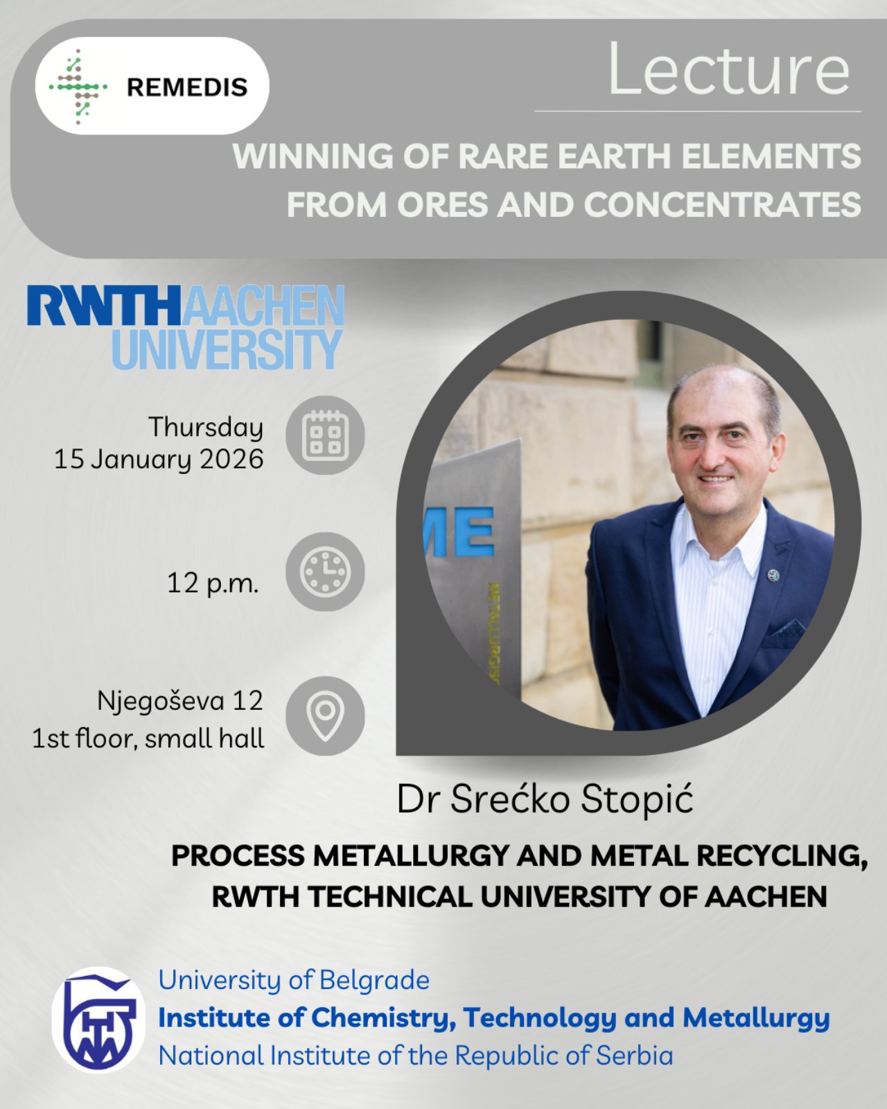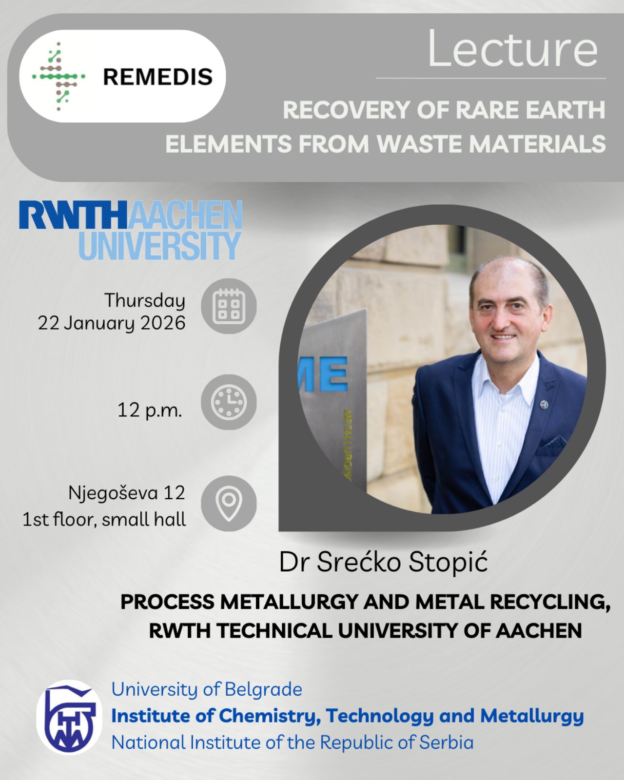 Predavanja se realizuju u okviru REMEDIS projekta i predstavljaju izuzetnu priliku za razmenu znanja i diskusiju o aktuelnim temama u oblasti retkih zemalja i njihovog recikliranja iz primarnih i sekundarnih izvora.